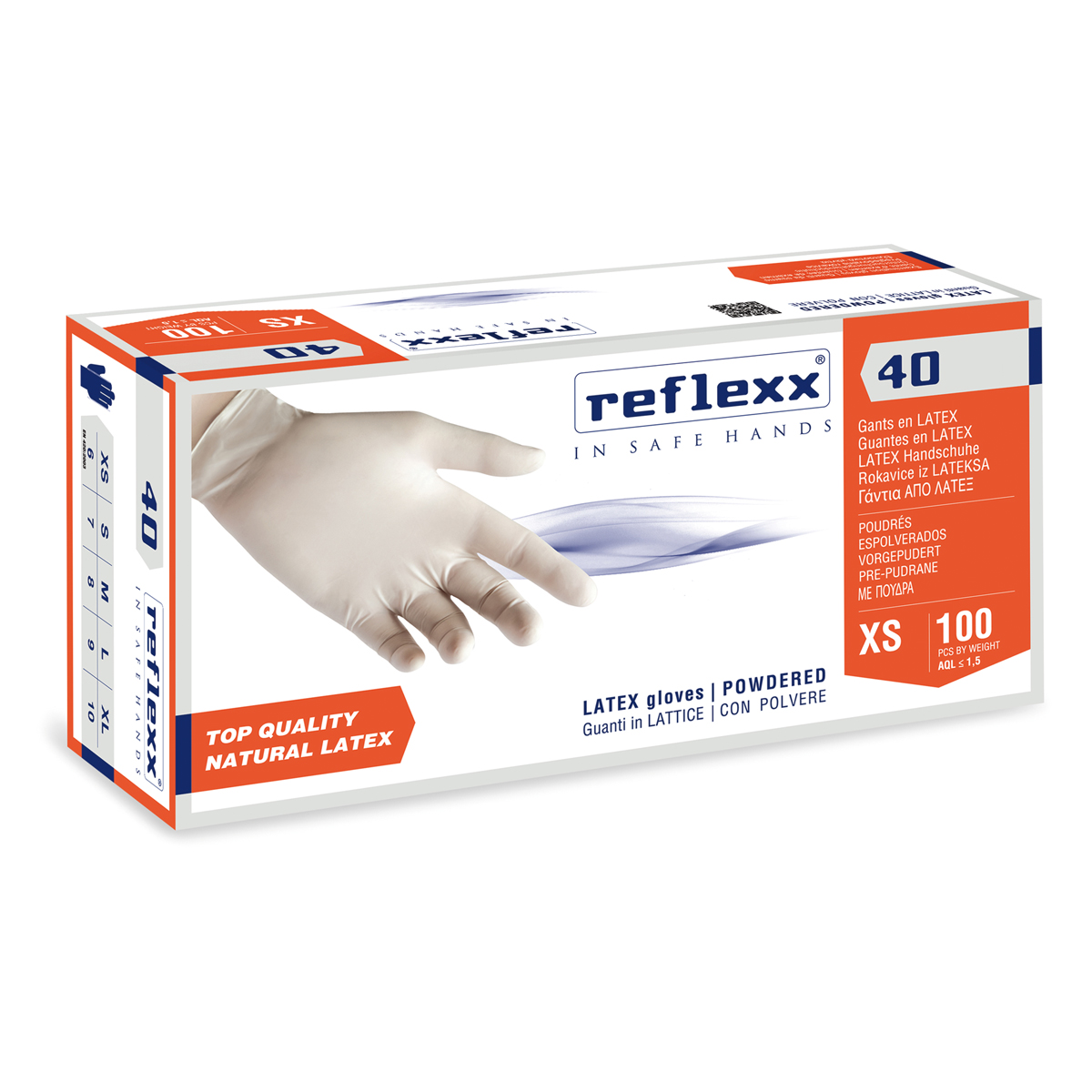 Guanti lattice con polvere misura XS–5/6 100 pezzi codice R40 ReflexxGUANTI IN LATTICE CON POLVERE gr. 5,4 (M), Monouso, ambidestri, finemente talcati con amido di mais bio–assorbibile. Prodotto di primissima scelta. Grande elasticità, sensibilità ed impermeabilità ottenute grazie all'Alta Tecnologia di produzione e selezione delle Materie Prime. DPI Cat. 3 di rischio anche per protezione da agenti chimici e microrganismi (ai sensi D.Lgs 475/92 in attuazione Dir. 89/686/CEE). DISPOSITIVO MEDICO in ambito ospedaliero e dentale (AQL 1,5), da esaminazione, anche invasiva, destinato ad un uso temporaneo (ai sensi della direttiva 93/42/CEE e successivo D.Lgs 37/2010 in attuazione Dir 2007/47/CEE Norme EN 455 1, 2, 3 & 4). MOCA Idonei al contatto con diverse tipologie di alimenti (conforme alla direttiva 2002/72/CEE, DM 21.3.1973, Reg. 2004/1935/CEE e Reg. UE 10/2011 e successivi aggiornamenti). LATEX POWDERED (LPE) Peso/Weight 5,4 gr. – Spess./Thick. 0,09 mm.