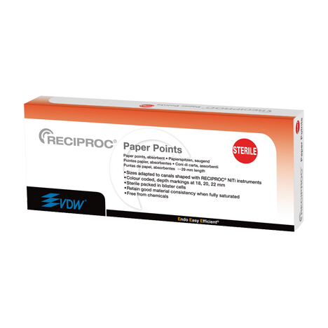 Coni di carta Reciproc R25 lunghezza 29 mm , iso 25 conicità .08 , codice colore rosso , 144 punte sterili V040216029025 VDW CONI PUNTE CARTA PAPIER